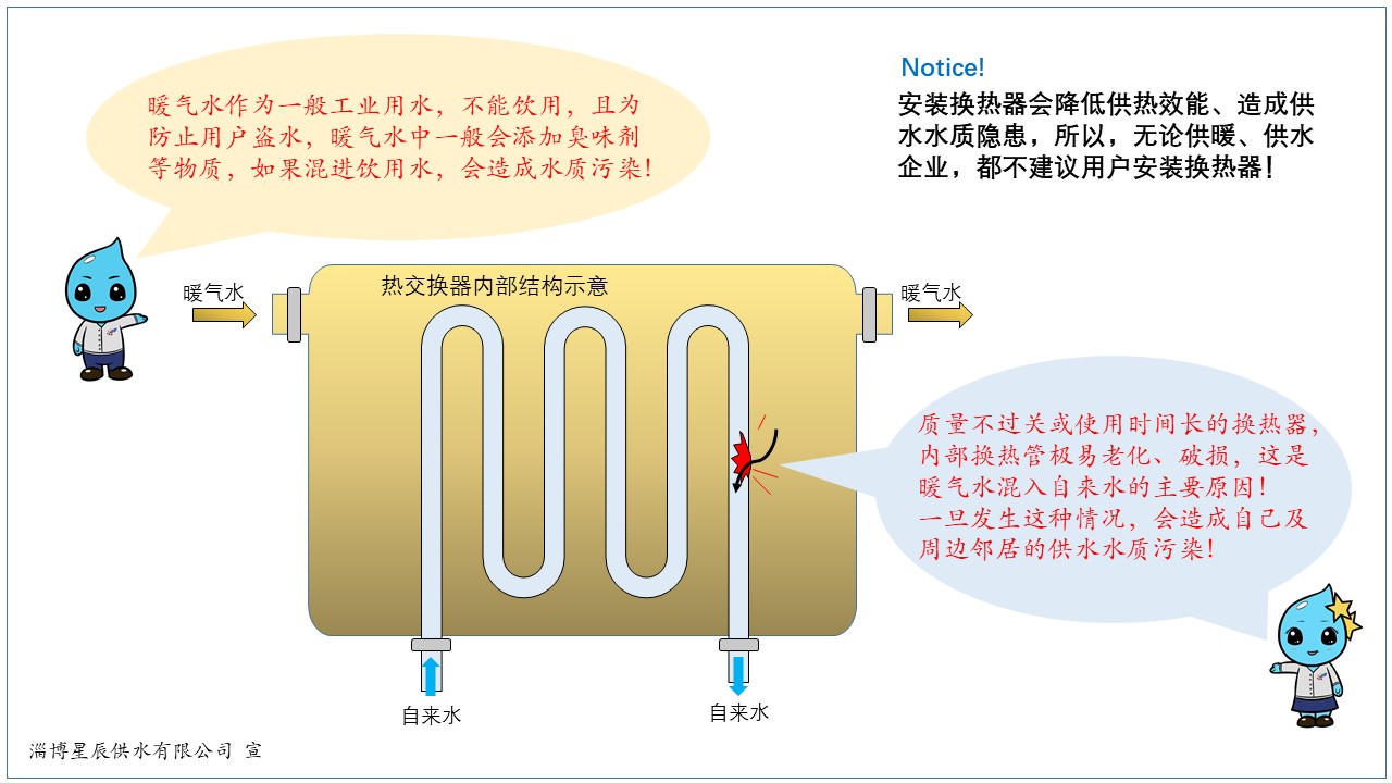 ★如果出現(xiàn)因換熱器引起的水質(zhì)污染,我公司將根據(jù)相關(guān)供水法規(guī),立即停止供水,直至水質(zhì)恢復(fù)正常;同時(shí),將按照《淄博市城市供水管理辦法》等相關(guān)規(guī)定依法追究用戶責(zé)任。
